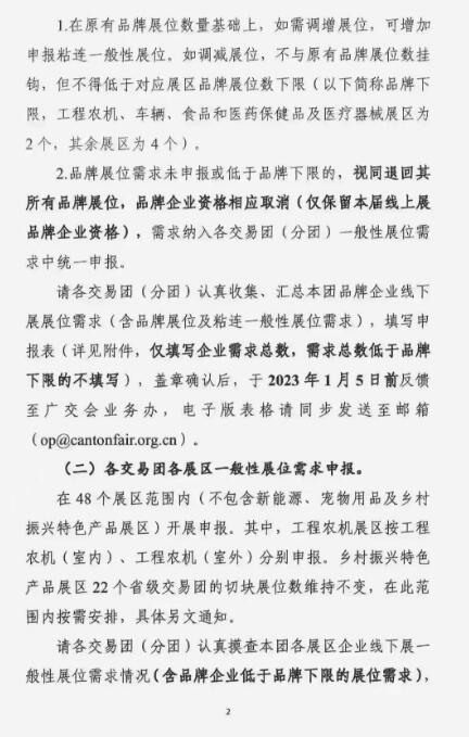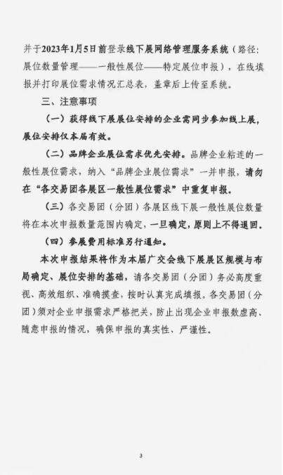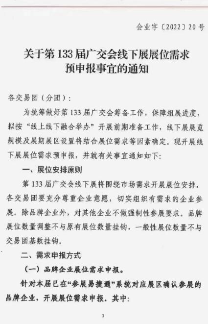 通知:133届广交会大会出文件了,133届确定线上线下开展,这次开展除品牌是强制性要求报名参加外,一般性摊位都是自愿报名参加为准,大会再根据各交易团报名企业数量然后决定展区规模和布局(三合一或开三期)如有计划参加的企业请与我联系!电话:020-34173028 34173038 34173098