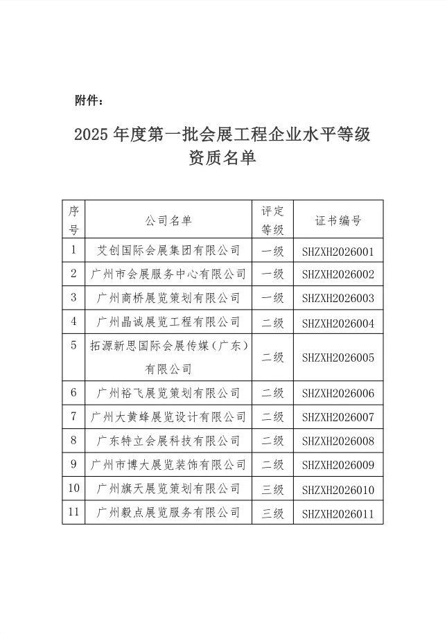关于公布2025年度第一批会展工程企业水平等级资质名单的通知